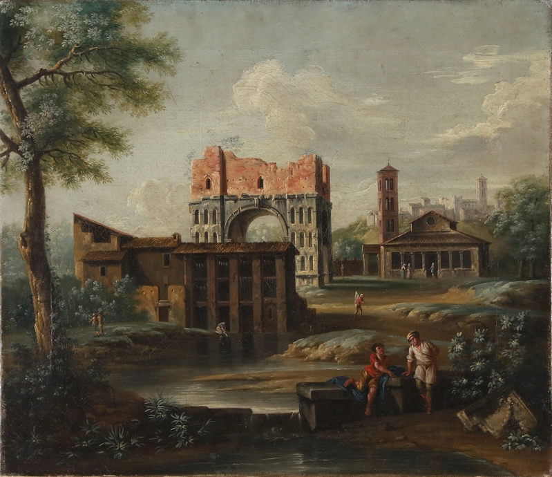 ARTISTA ITALIANO DEL XVIII SECOLO Paesaggio con figure e ruderi. Olio su tela...