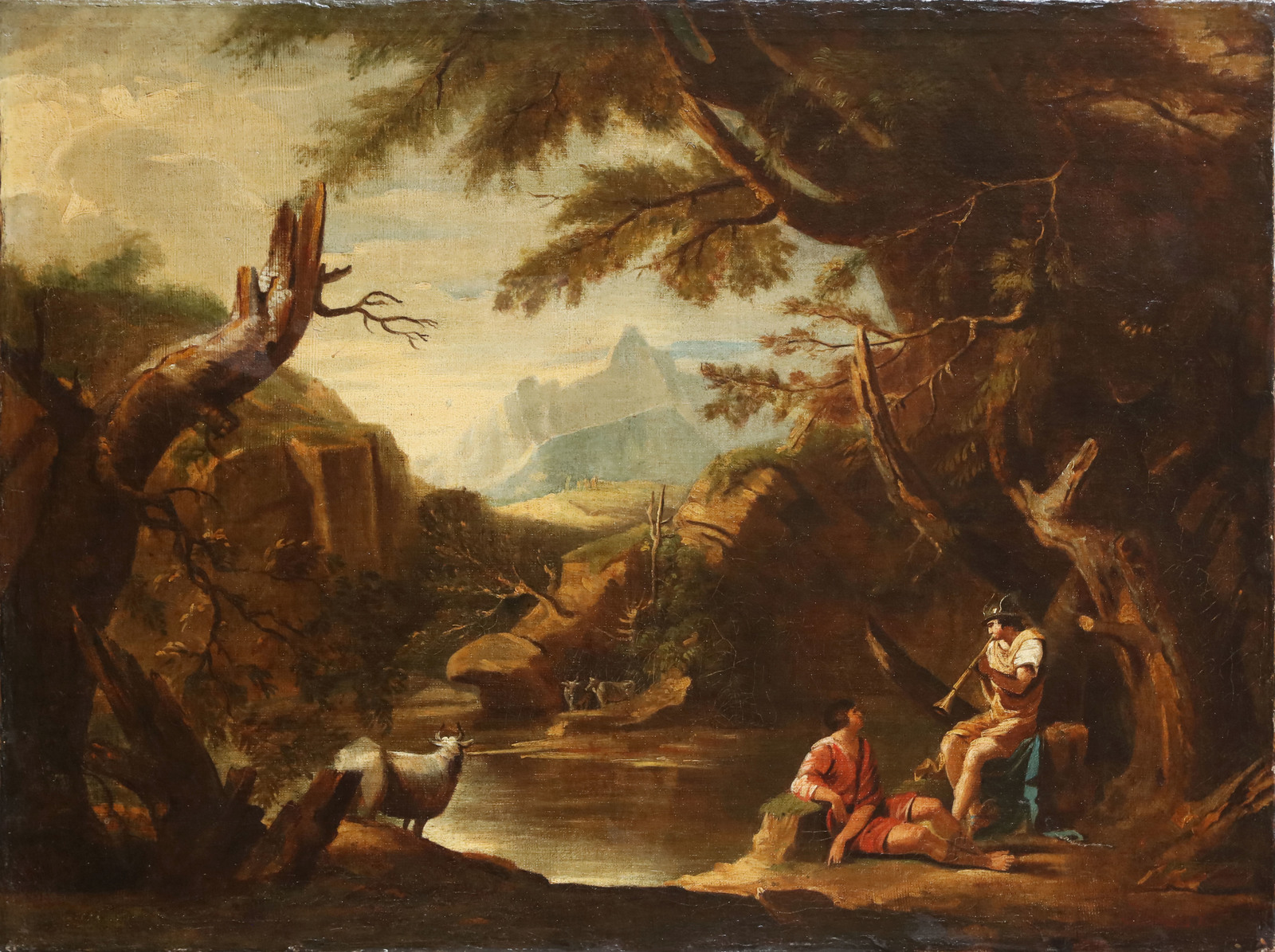 ARTISTA ROMANO DEL XVII SECOLO Paesaggio con musicanti e armenti. Olio su...