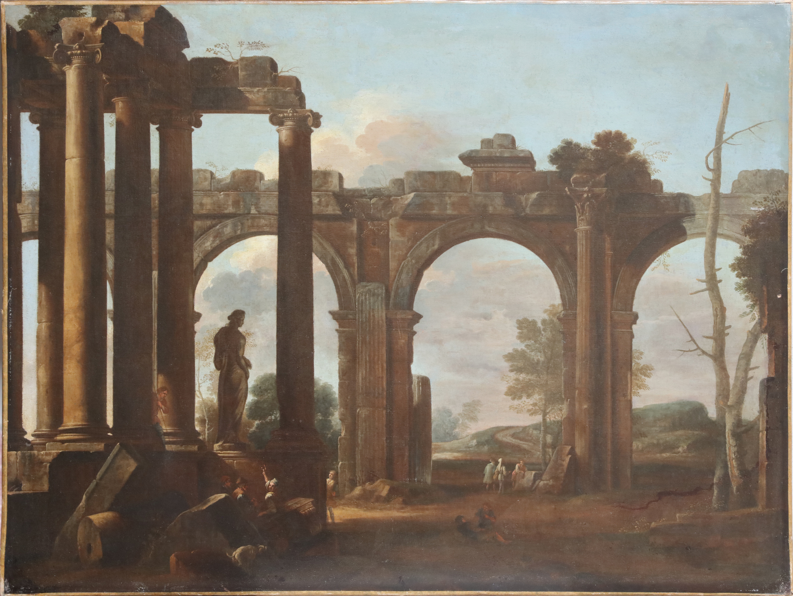 ARTISTA ROMANO DEL XVII SECOLO Paesaggio con rovine e personaggi. Olio su tela . Cm 98,00 x 74,00. . Cornice presente