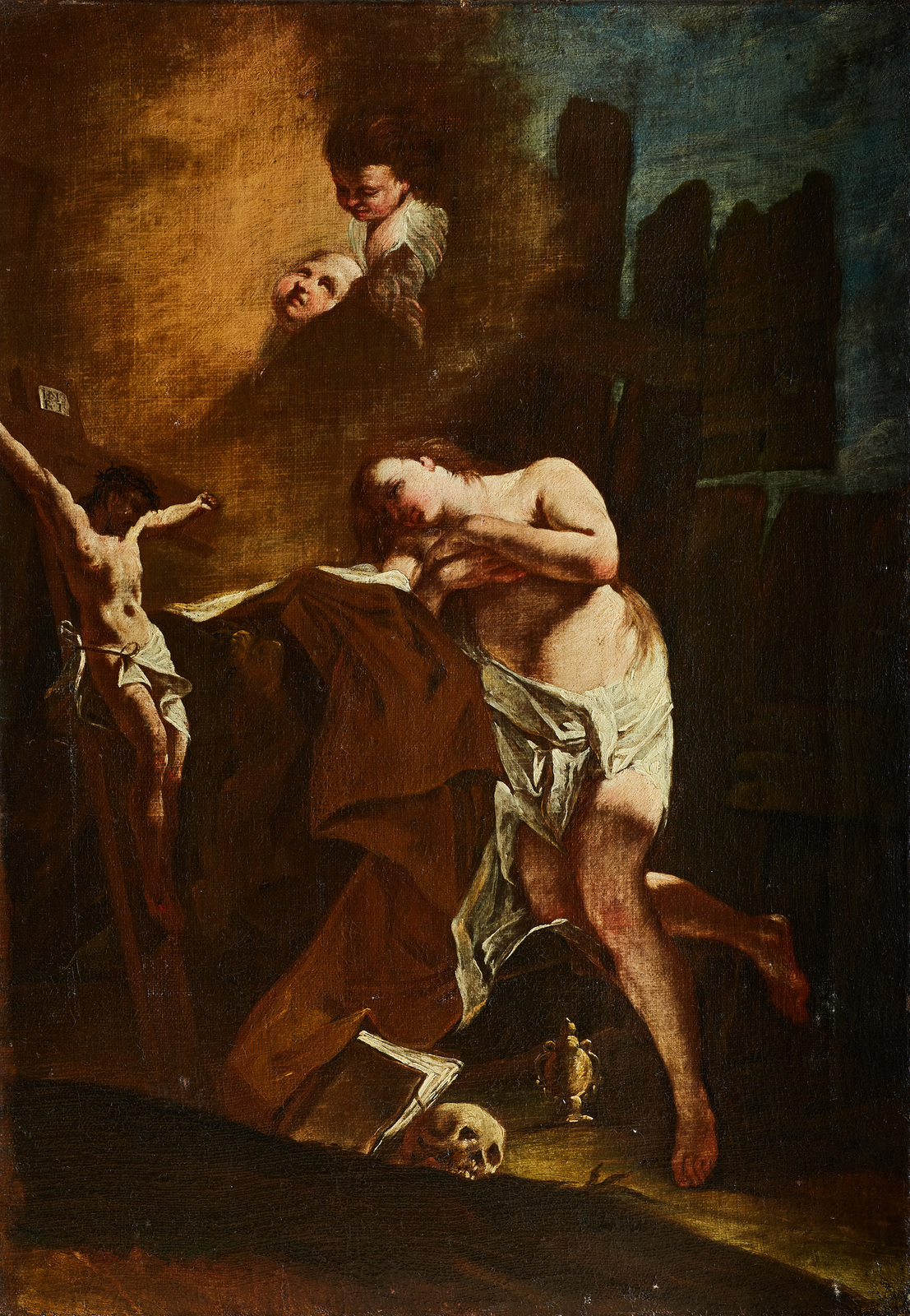 ARTISTA VENETO DEL XVII SECOLO Maddalena penitente. Olio su tela . Cm 46,50 x 67,00.