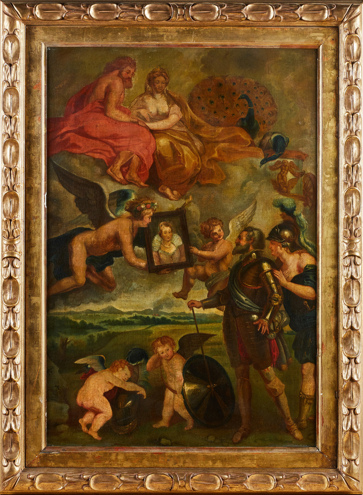 SCUOLA OLANDESE DEL XVIII SECOLO Scena allegorica. Olio su tela . Cm 61,00 x 88,00. . Cornice presente