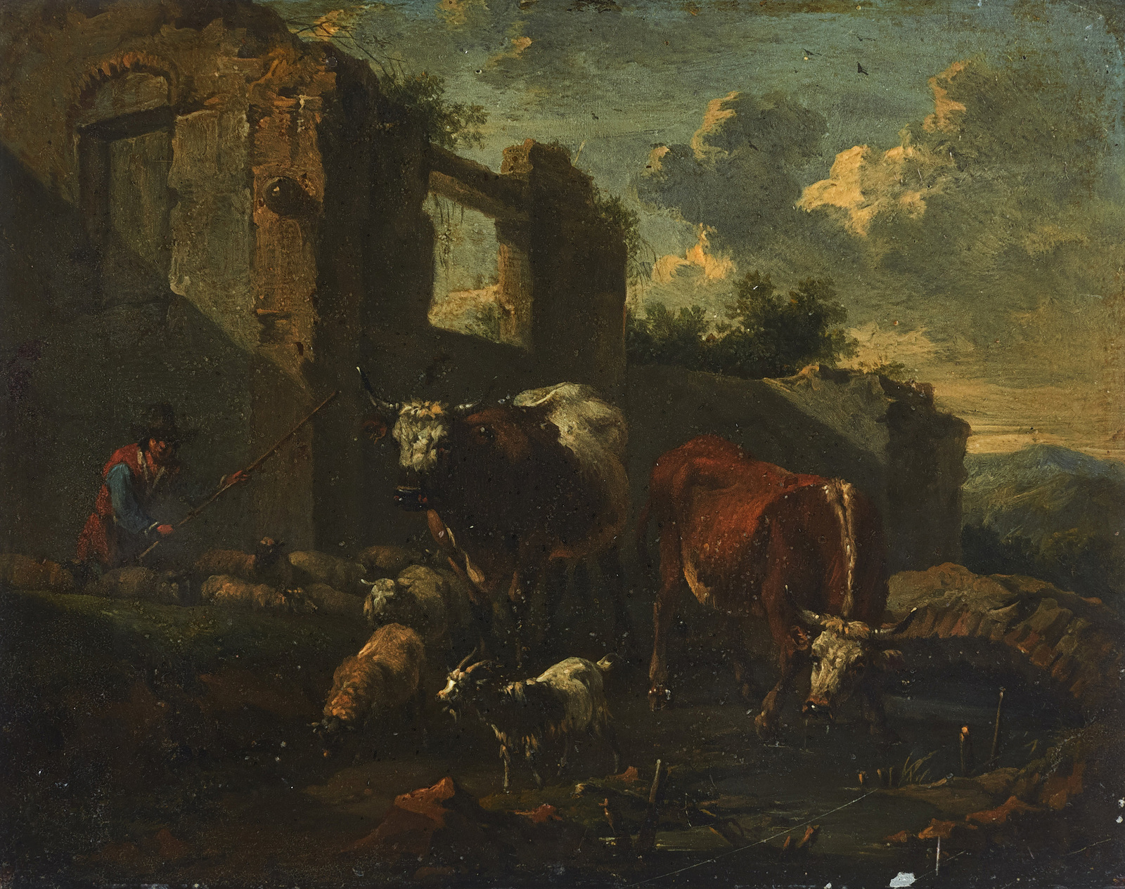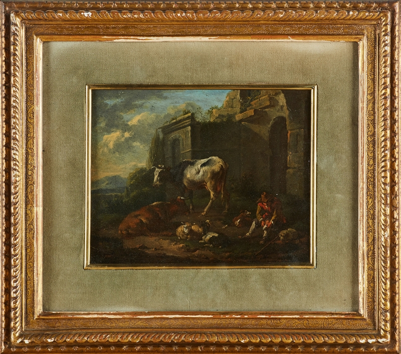 VAN DE VELDE ADRIEN (1636 - 1672) Coppia di paesaggi con rovine, armenti e pastore. Olio su rame. Cm 19,00 x 15,00. Riporta antica dicitura al retro "A van Velde". Cornice presente