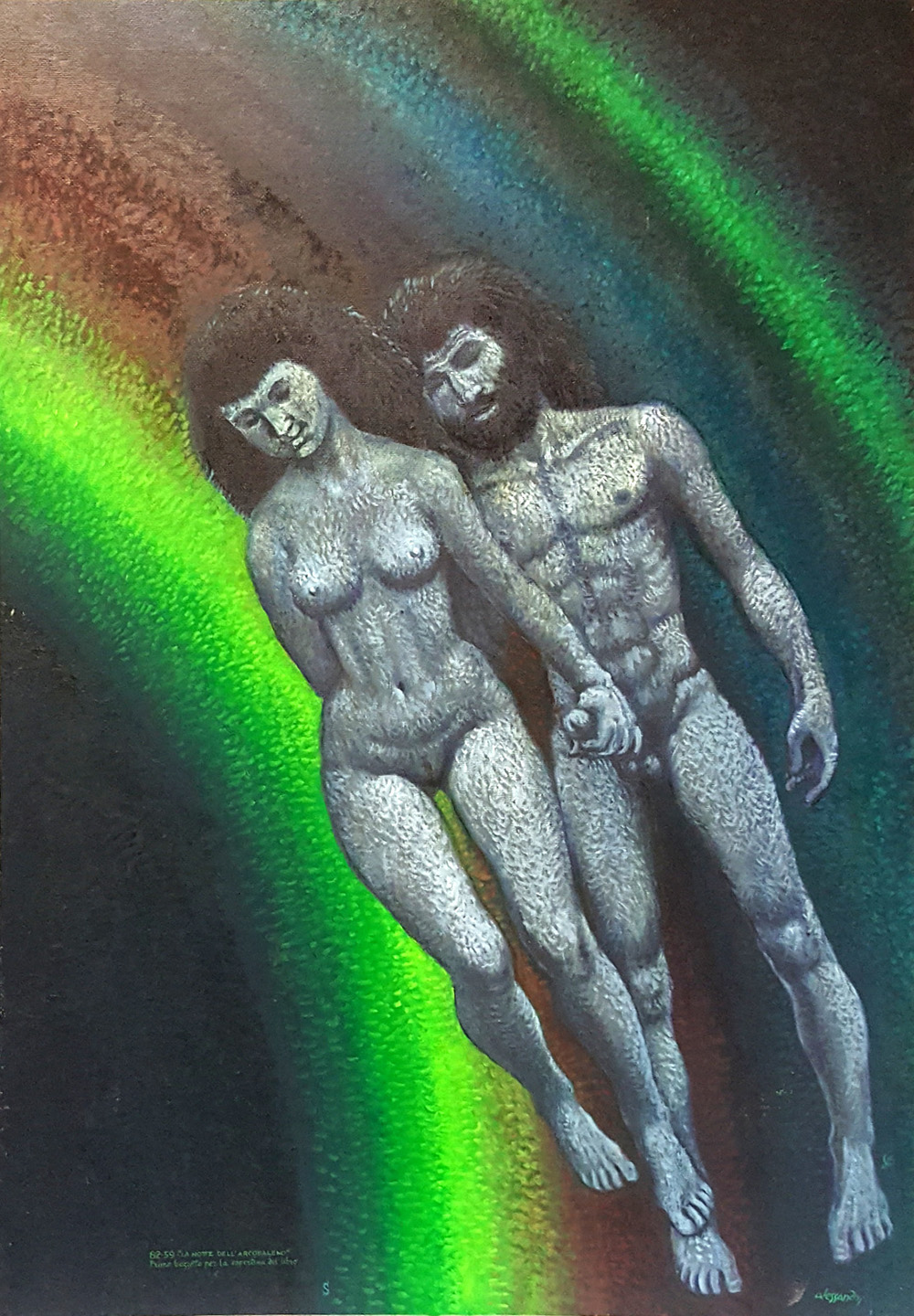 Lorenzo Alessandri, "La notte dell'arcobaleno", 1982, olio su masonite cm 100x70, firma in basso a destra, titolo e nr.archivio in basso a sinistra, titolo firma ed anno al retro