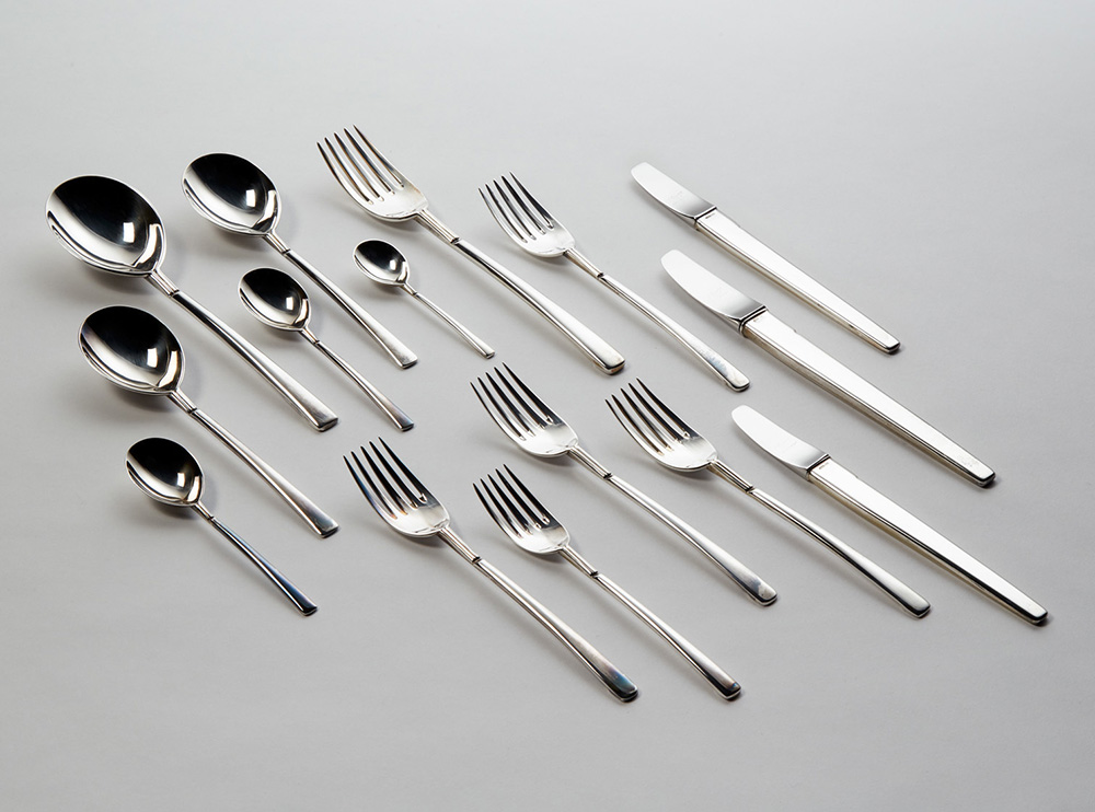 Servizio di posate in argento 925 composto da due cucchiai da portata, due forchette da portata, dodici cucchiai, ventiquattro forchette, dodici coltelli, dodici cucchiai da dessert, dodici forchette da dessert, dodici coltelli da dessert, dodici cucchiaini da caffè. Esecuzione Cleto Munari, Vicenza 1977 (gr 4500 circa)