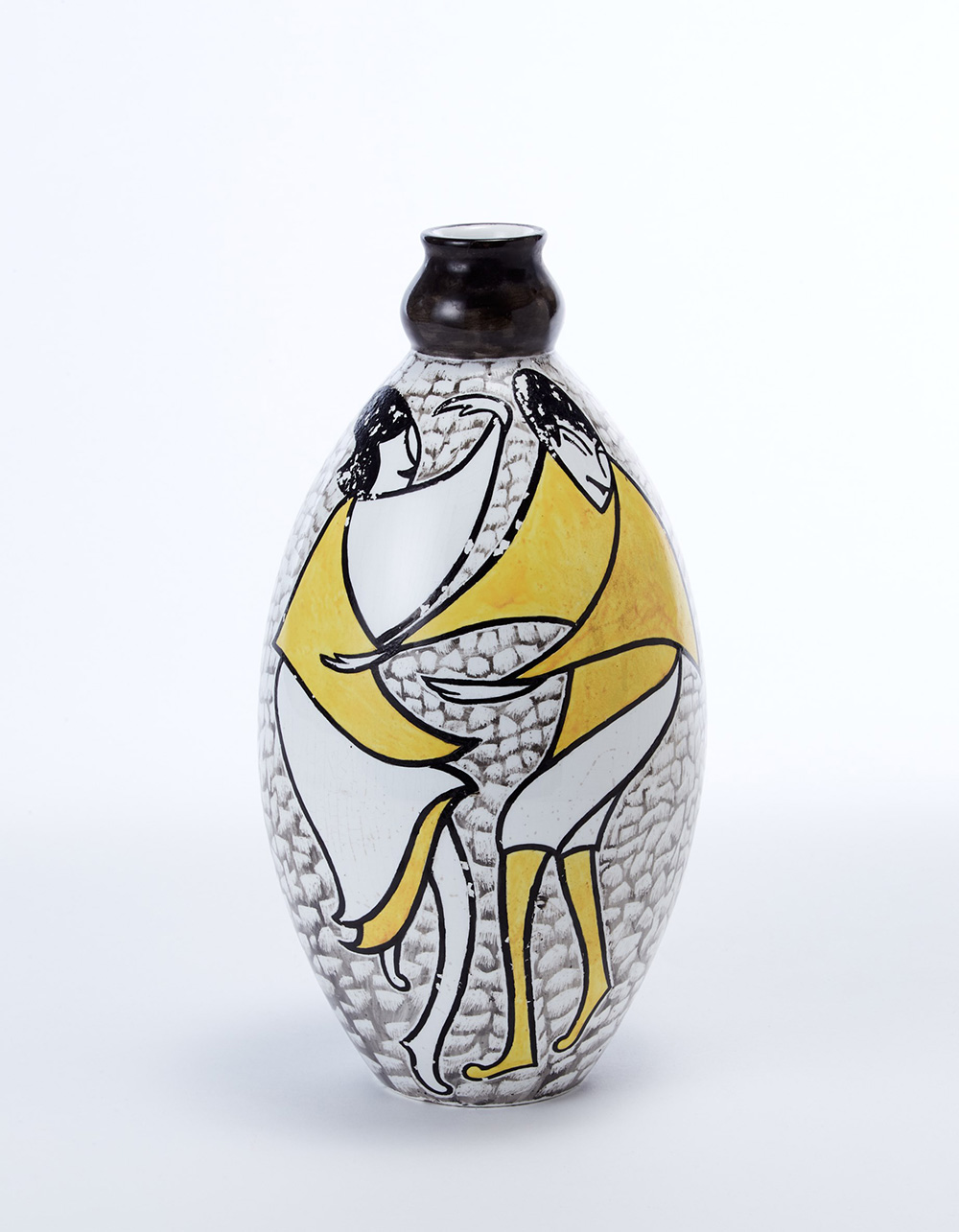 Lenci Vaso in ceramica formata a colaggio decorato a smalto con pennellate in grigio sotto vetrina e con figure femminili danzanti di gusto déco, profilate in grigio e a campiture gialle. Torino, secondà metà degli anni 20 (h cm 48) (lievi difetti)