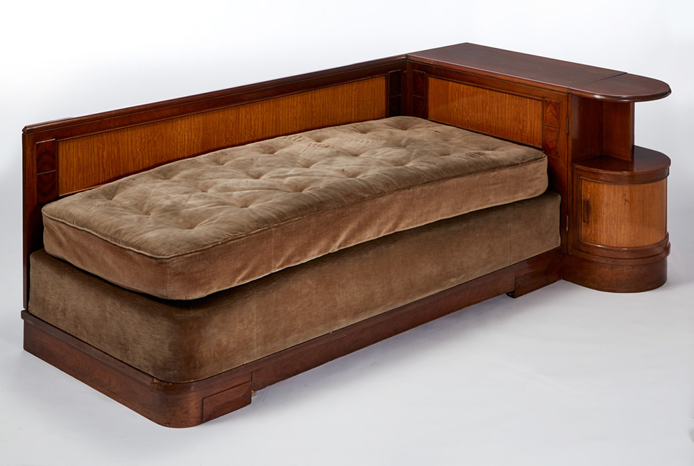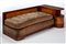 Giuseppe Gibelli Divano-letto angolare, lastronato in legno di noce e mogano, testata contenitore attrezzata con comodino semicilindrico a un'anta e ripiano a giorno. Italia anni 30 (cm 242x82x128) (difetti)