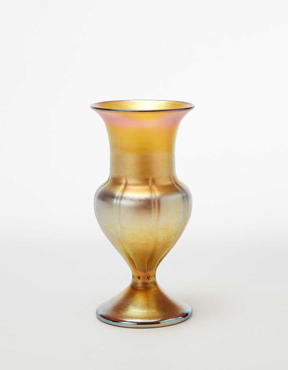 Tiffany Vaso a balaustro con corpo scanalato in vetro "Favrile". New York, prima metà del sec XX. Firmato "L.C.Tiffany-Favrile" sotto la base e numerato 1553 (h cm 22) (lievi difetti)