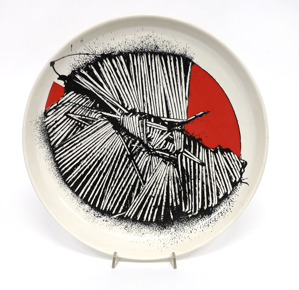 Emilio Scanavino (Genova 1922 - Milano 1986) Piatto in ceramica smaltata e decorata in rosso e nero su fondo bianco. Firmato e numerato 11/50 sotto la base (d cm 42) Glazed ceramic plate decorated in black and red. Signed and numbered 11/50 to base (d. cm 42)