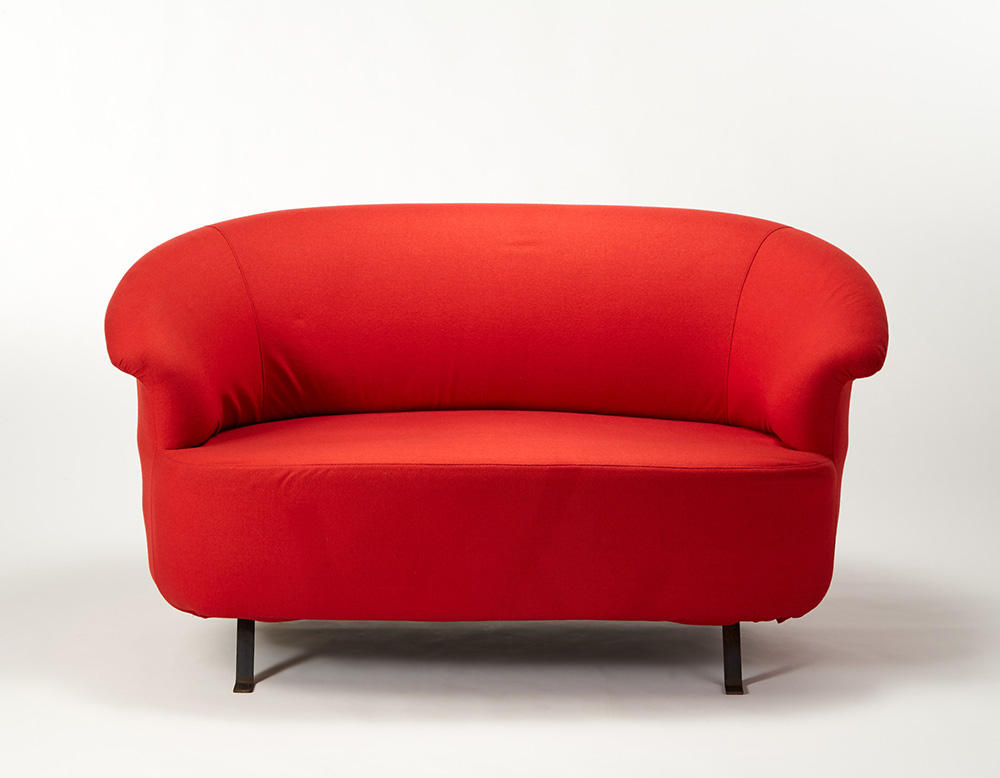 Marcello Cuneo (Cagliari 1933 - 2015) Prototipo di divano imbottito a due posti. rivestimento in panno rosso, gambe metalliche verniciate nere. Produzione BBB Bonacina, Meda, anni 70 (cm 135x74x74)