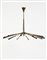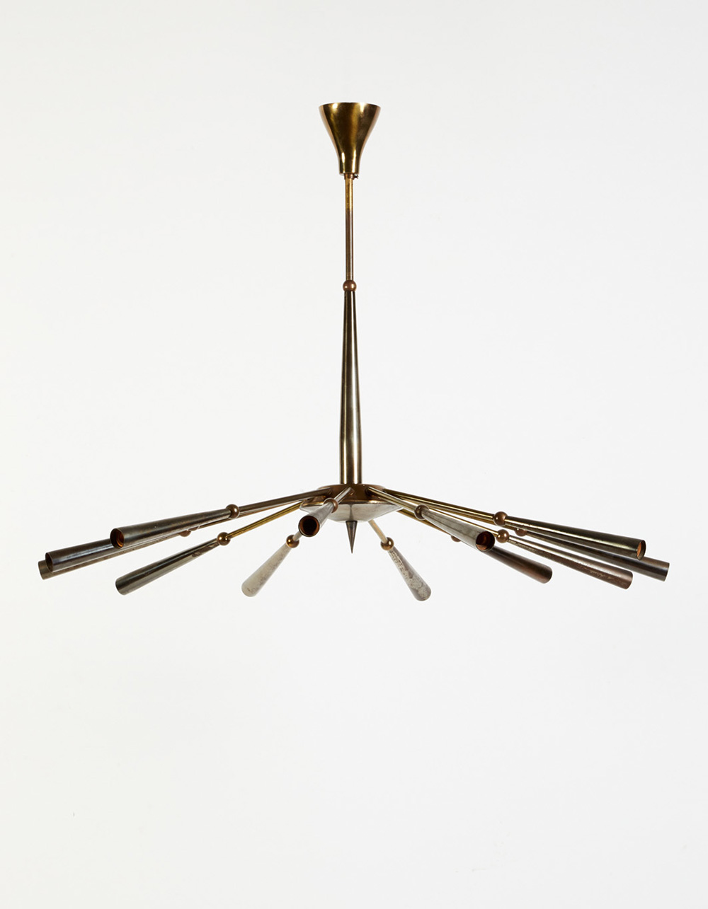 Lampada a sospensione a dodici luci in tubolare di ottone brunito con finali troncoconici. Produzione italiana, anni 60 (d cm 83, h cm 55) (lievi difetti) A tubular and burnished brass twelve-light lamp. Italian production, 1960s (d cm 83, h cm 55) (minor defects)