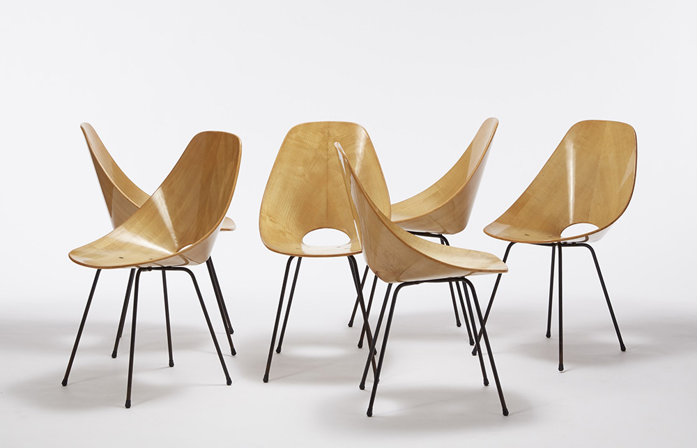 Vittorio Nobili (attribuito) (1935) Sei sedie modello "Medea". Produzione Fratelli Tagliabue, Italia 1955 ca. Ferro verniciato nero, legno di noce verniciato (cm 46x82x56) (difetti) Bibliografia: "Domus", n. 329, aprile 1957, pubblicità; "Rivista dell'arredamento", n. 46, ottobre 1958, pubblicità; G. Gramigna, Repertorio del design italiano 1950-2000 per l'arredamento domestico, Allemandi, Torino, 2003, p. 40; Il libro dell'arredamento, Hoepli, Milano, 1958, sez. 7, p. 28