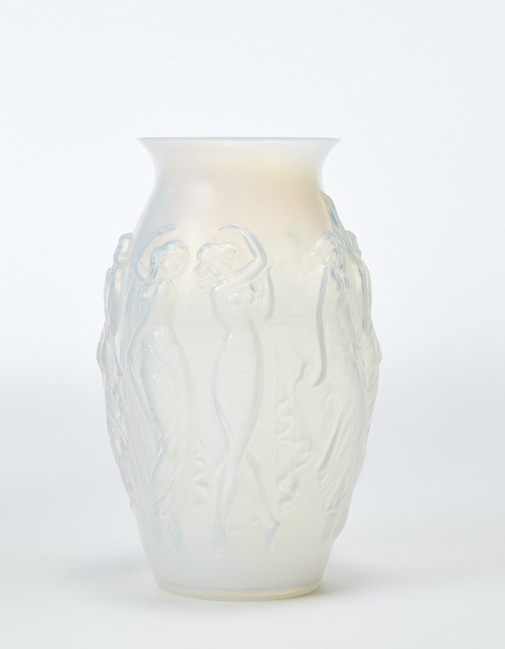 Sabino Grande vaso in vetro opalescente soffiato in stampo e decorato a rileivo con figure feminili danzanti. Parigi, anni 20. Firmato a punta sotto la base "Sabino Paris" (h cm 35,5)