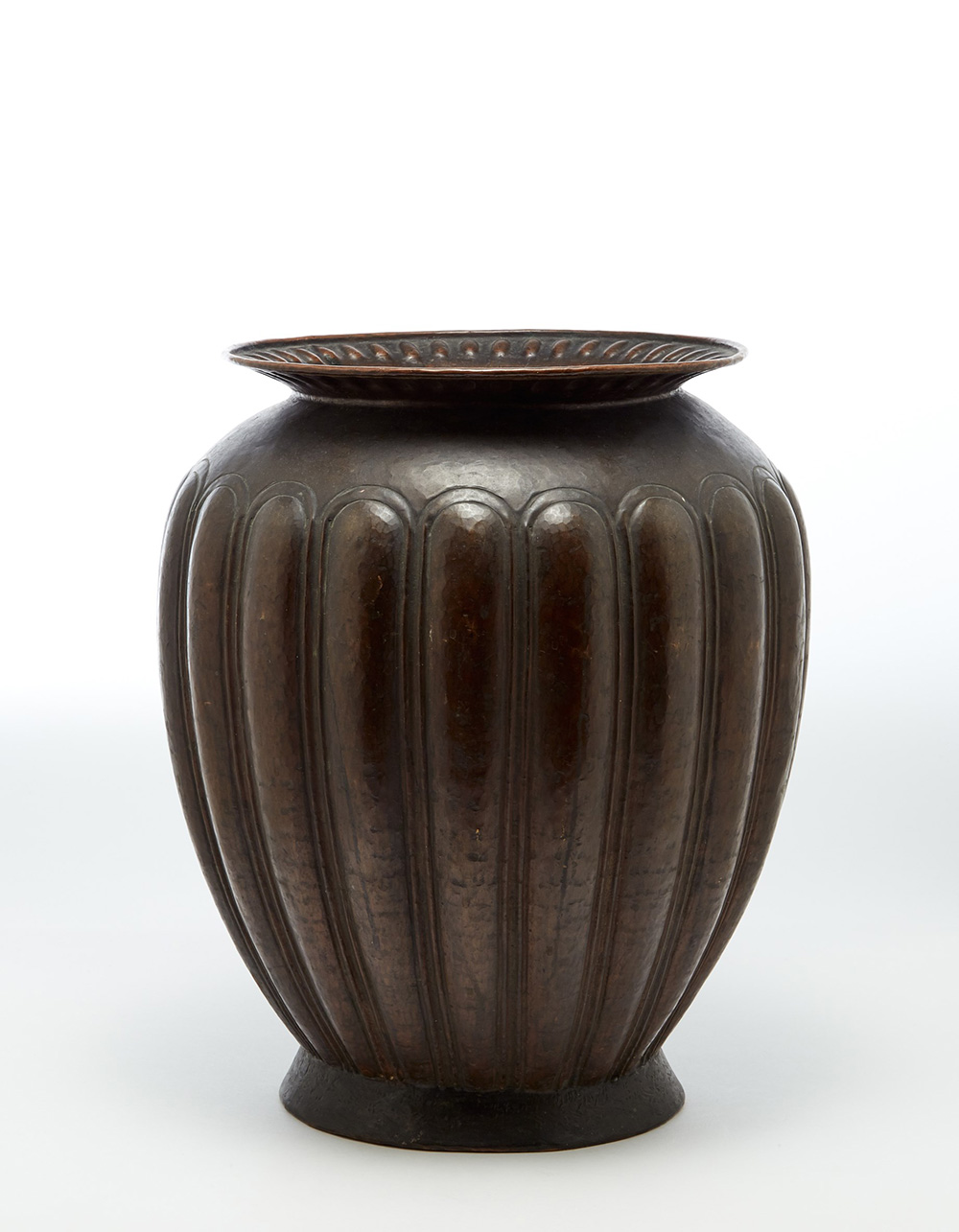 Vittorio Zecchin (Murano 1878 - Murano 1947) Grande vaso in rame martellinato, corpo affusolato con costolature, collo svasato sbalzato ad ovuli, base troncoconica. Esecuzione Giulio Zanin Metalli Sbalzati, Venezia, 1928 ca. (h cm 56) (difetti) Esposizioni per modello simile: Un vaso di analoga composizione, realizzato per l'Enapi (Ente Nazionale Artigianato e Piccole Industrie) fu esposto all'Esposizione Internazionale di Torino nel 1928 Bibliografia per oggetti simili: Catalogo ufficiale dell'esposizione, 1928; "Domus", n. 11, novembre 1928, s.p.; M. Barovier, M. Mondi, C. Sonego, Vittorio Zecchin 1878-1947. Pittura, vetro, arti decorative, Marsilio, Venezia 2002, pp. 296-297.