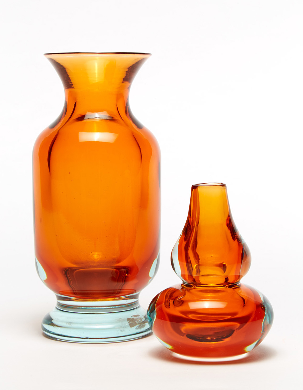 Seguso (attribuito) Lotto di due vasi in vetro sommerso verdino e arancione. Murano, anni 60 (hmax cm 35,5) Lot comprising two sommerso glass vases. Murano 1960s ( h max cm 35.5)