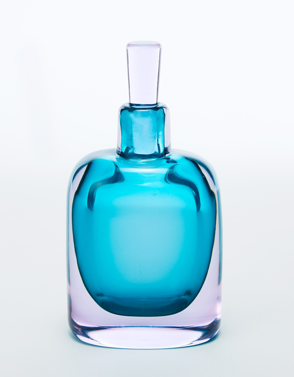 Seguso (attribuito) Piccola bottiglia con tappo in vetro sommerso ametista chiaro e verde acqua. Murano anni 60 (d cm 11, h cm 21,5)