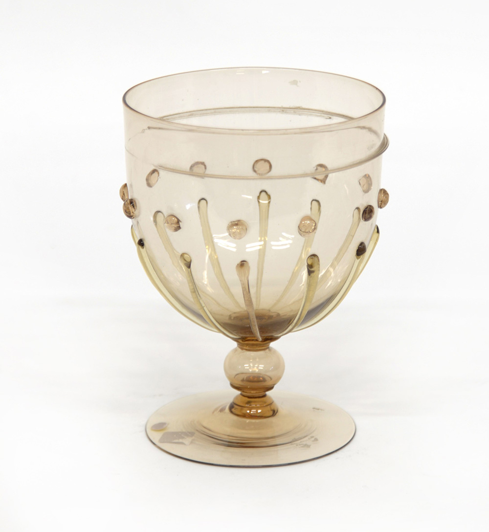 Vittorio Zecchin (Murano 1878 - Murano 1947) Calice in vetro soffiato pagliesco con base applicata a balaustro, filamenti e gocciole applicate a caldo. Probabile esecuzione Venini, anni 20. Il modello presenta alcuni caratteri comuni con i modelli "Costolati", in particolare con il disegno n. 1850 del Catalogo Venini (h cm 16,5) (lievi difetti e piccole mancanze) Bibliografia: Vittorio Zecchin. I vetri trasparenti per Cappellin e Venini, a cura di M. Barovier e C. Sonego, Skira, Milano 2017, p. 329