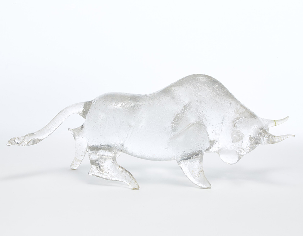 Flavio Poli (Chioggia 1900 - Venezia 1984) "Toro" Scultura in vetro verdino chiarissimo fortemente corroso. Seguso, Murano, anni 30 (l cm 55) (restauri)
