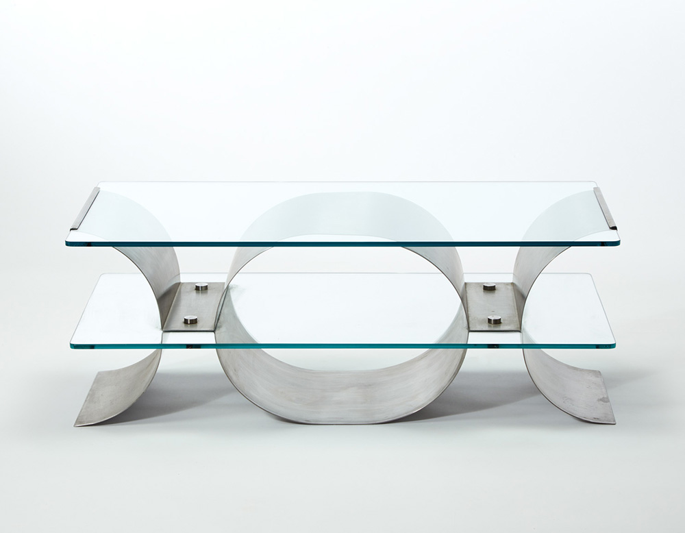 Francois Monnet (1946) Tavolo basso in lastre calandrate di acciaio inossidabile, due ripiani in vetro molato. Produzione Kappa, Francia 1970 ca. (cm 100x38,5x50)