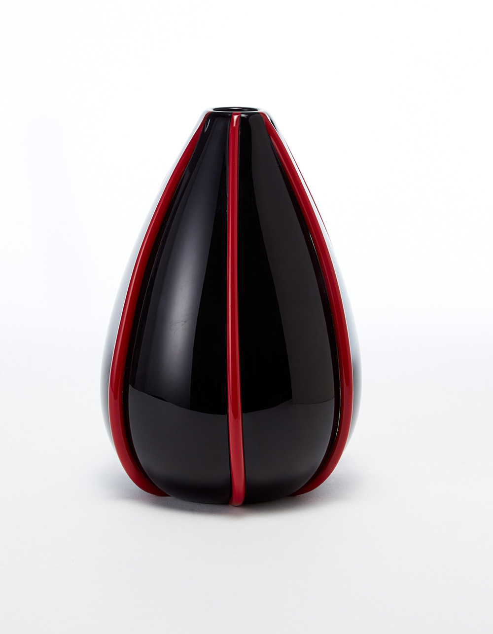Archimede Seguso (Murano 1909 - Murano 1999) Vaso a goccia "a costolature verticali" in vetro ametista scuro con canne a forte rilievo in pasta vitrea rossa. Murano anni 60 (h cm 23,5)