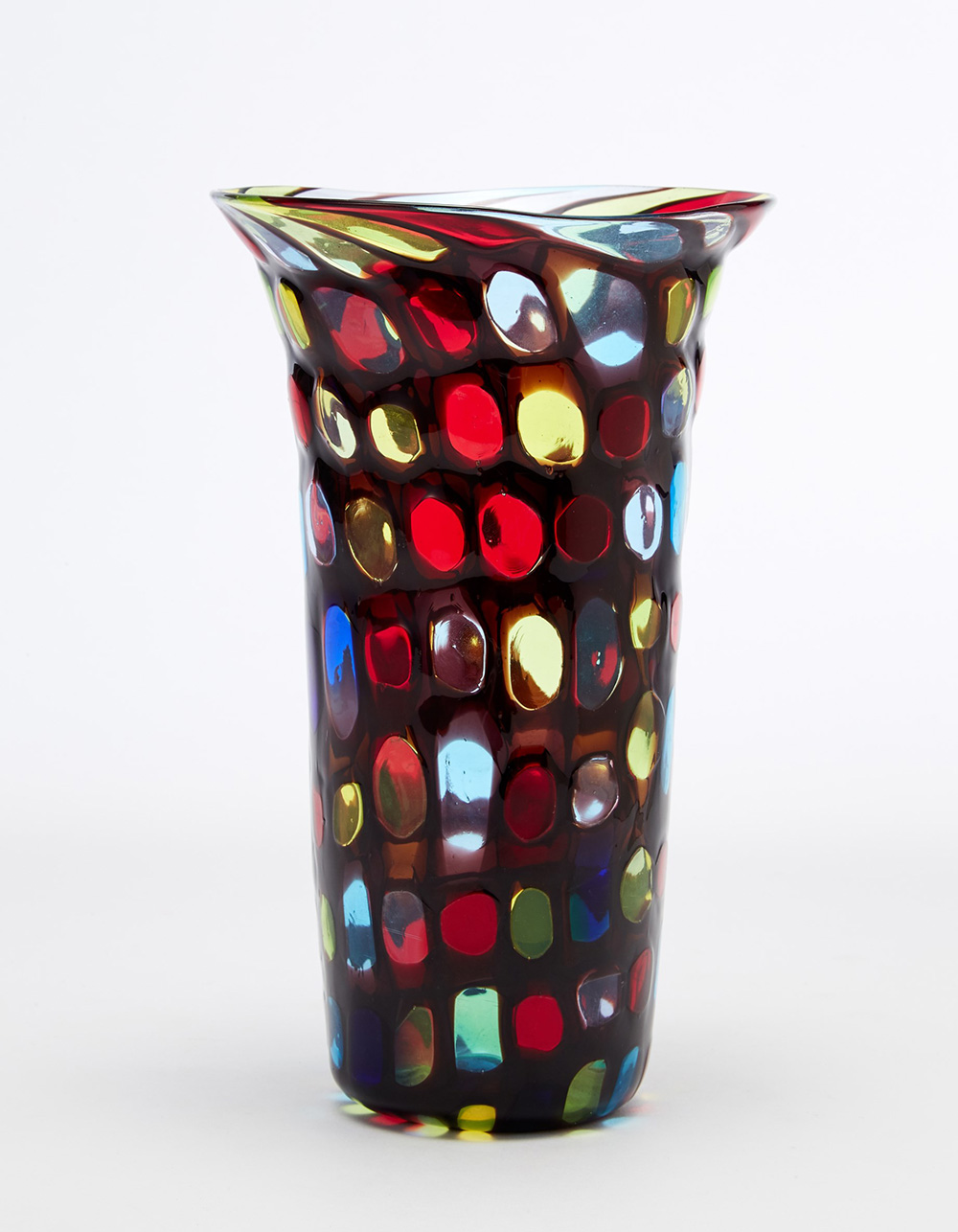 Manifattura di Murano, vaso a "lenti" policrome su fondo ametista. Anni 70/80 (h cm 24)