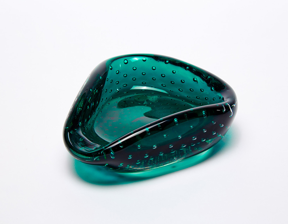 Venini Svuotatasche in vetro trasparente verde con inclusione di bolle regolarmente distribuite. Murano, anni 50. Firmato all'acido "venini murano ITALIA" sotto la base (d cm 18)