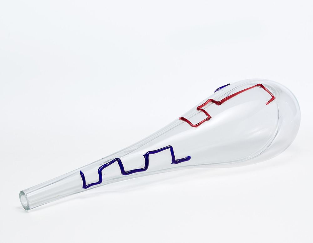 Toni Zuccheri (Venezia 1937 - 2008) Scultura in vetro soffiato incolore con membrana interna e applicazioni di fili in vetro trasparente rosso e blu. Salviati, Murano, anni 70. Firmata a punta all'imboccatura del collo "Salviati" (l cm 50) (lievi difetti)
