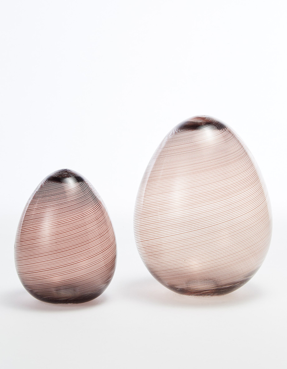 Venini Due uova in vetro soffiato a mezza filigrana ametista e incolore,...