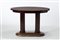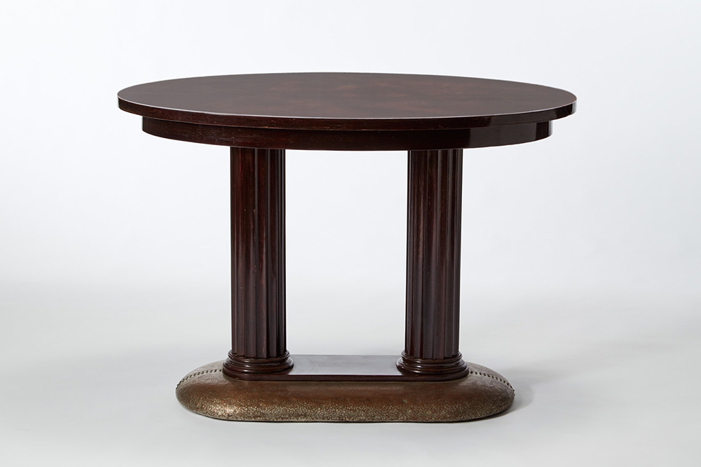 Tavolino da ingresso in legno impiallacciato e massello con piano ovale, gambe scanalate in foggia di colonna dorica, basamento rivestito in lamina di rame martellinato. Italia, anni 30 (cm 104x72x64,5) (lievi difetti) Oval foyer table in veneered wood, with doric column legs, base covered in hammered copper sheet. Italy 1930s (cm 104x72x64.5) (minor defects)