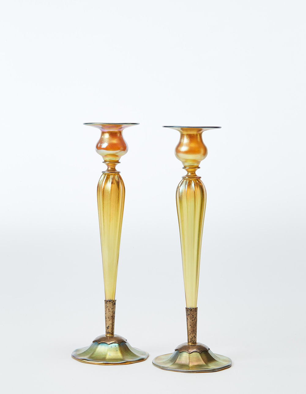 Tiffany Coppia di portacandele in vetro "Favrile" e ottone. New York, prima metà del sec XX. Un esemplare firmato "L.C.T. Favrile" sotto la base, numerati rispettivamente 5736 e 5737 (h cm 30) (lievi difetti)