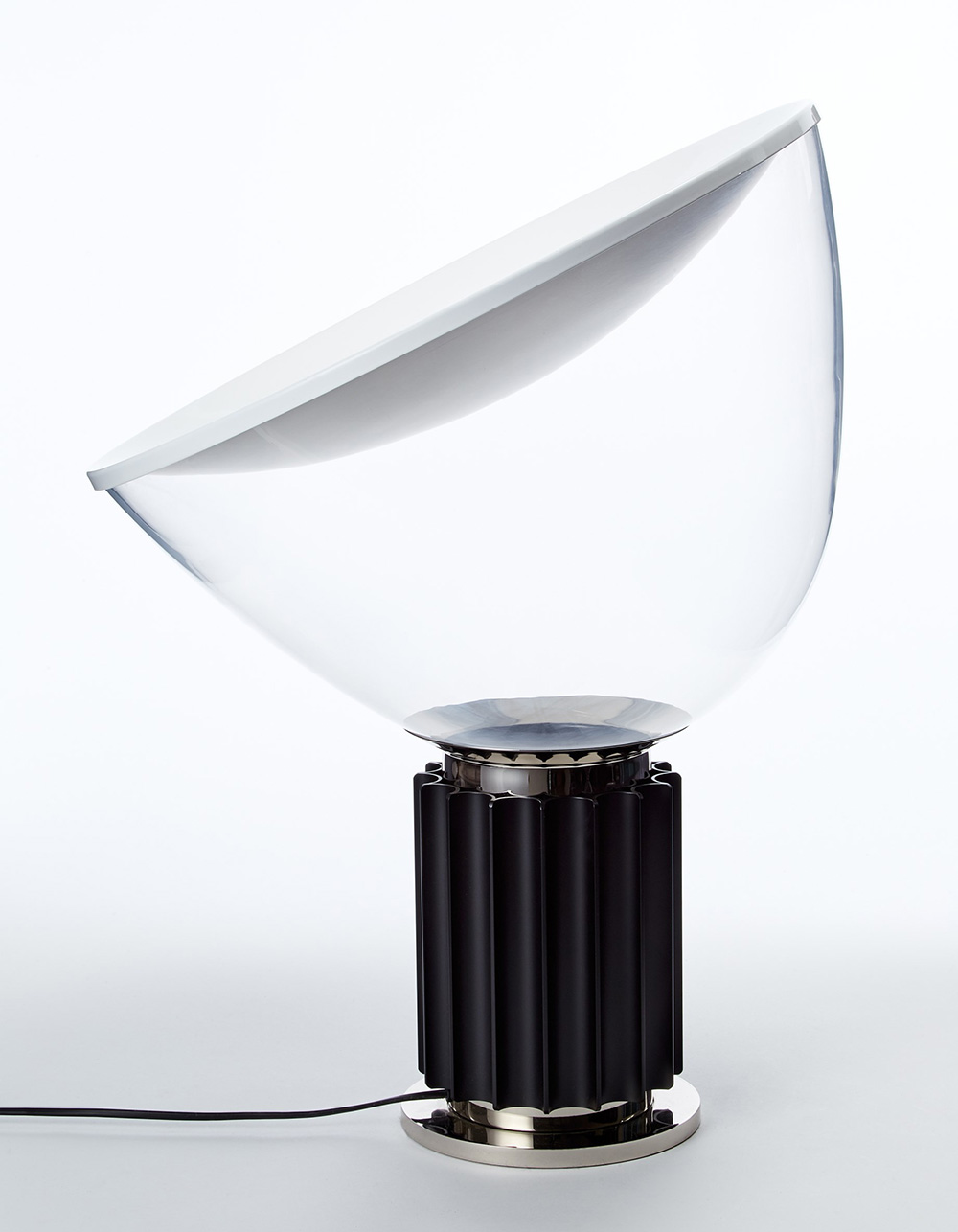 Achille e Piergiacomo Castiglioni Lampada da tavolo "Taccia", con riflettore in alluminio verniciato bianco e vetro trasparente. Corpo in alluminio e metallo nero. Produzione Flos dal 1962 (h cm 54) Bibliografia: Giuliana Gramigna, Repertorio 1950/1980. Immagini e contributi per una storia dell'arredo italiano, Arnoldo Mondadori, Milano1985, p. 188.