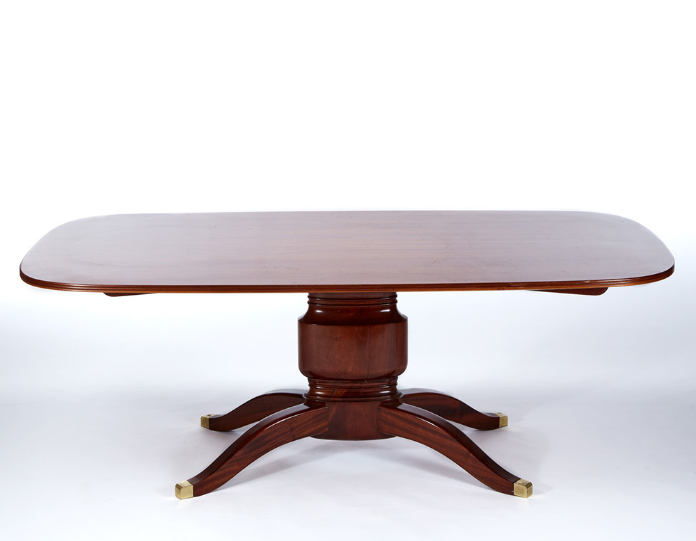 Tavolo da pranzo in legno di mogano massello, impiallacciato e bordato, piano ovoidale, colonna centrale a balaustro su quattro gambe inflesse a crociera con puntali in ottone. Esecuzione italiana, anni 40 (cm 220x78x110) (lievi difetti e restauri) Mahogany and veneered dinner table with oval top and central baluster column, brass sabots. Italian production 1940s (cm 220x78x110) (monor defects and restorations)
