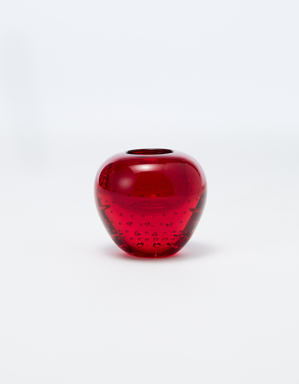 Venini Piccolo portacandele in vetro rosso trasparente con inclusione di bolle. Murano, anni 50. Firmato all'acido sotto la base "venini ITALY murano" (h cm 5) Small transparent red glass candleholder. Murano 1950s. Signed to base "venini ITALY murano" (h cm 5)