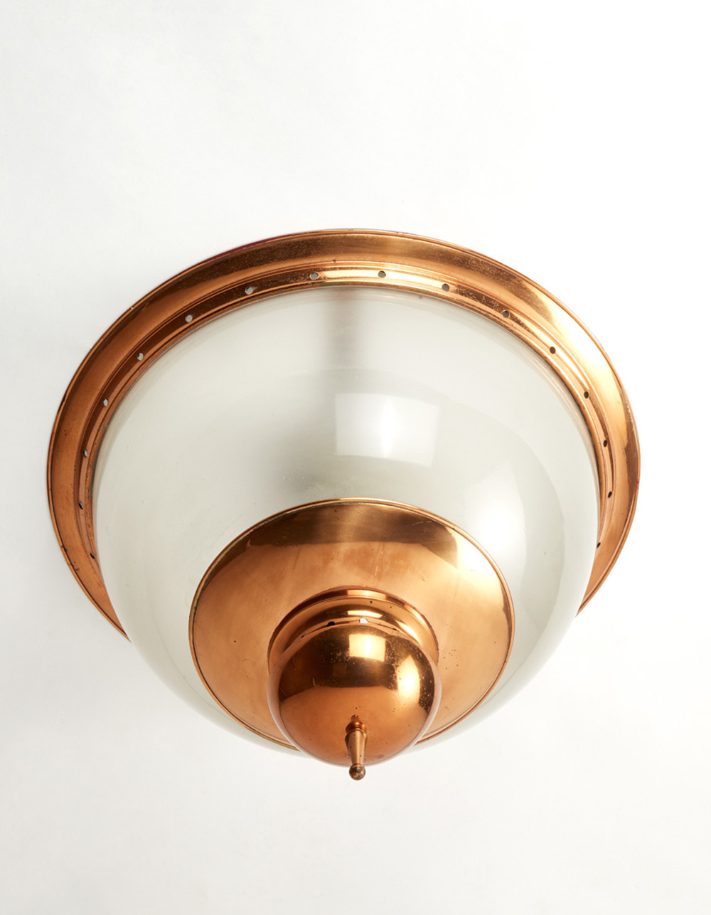 Luigi Caccia Dominioni (Milano 1913 - Milano 2016) Plafoniera in ottone dorato con paralume in vetro satinato sulla superficie interna. Produzione Azucena, Milano, anni 60 (d cm 46, h cm 35) (lievi difetti)