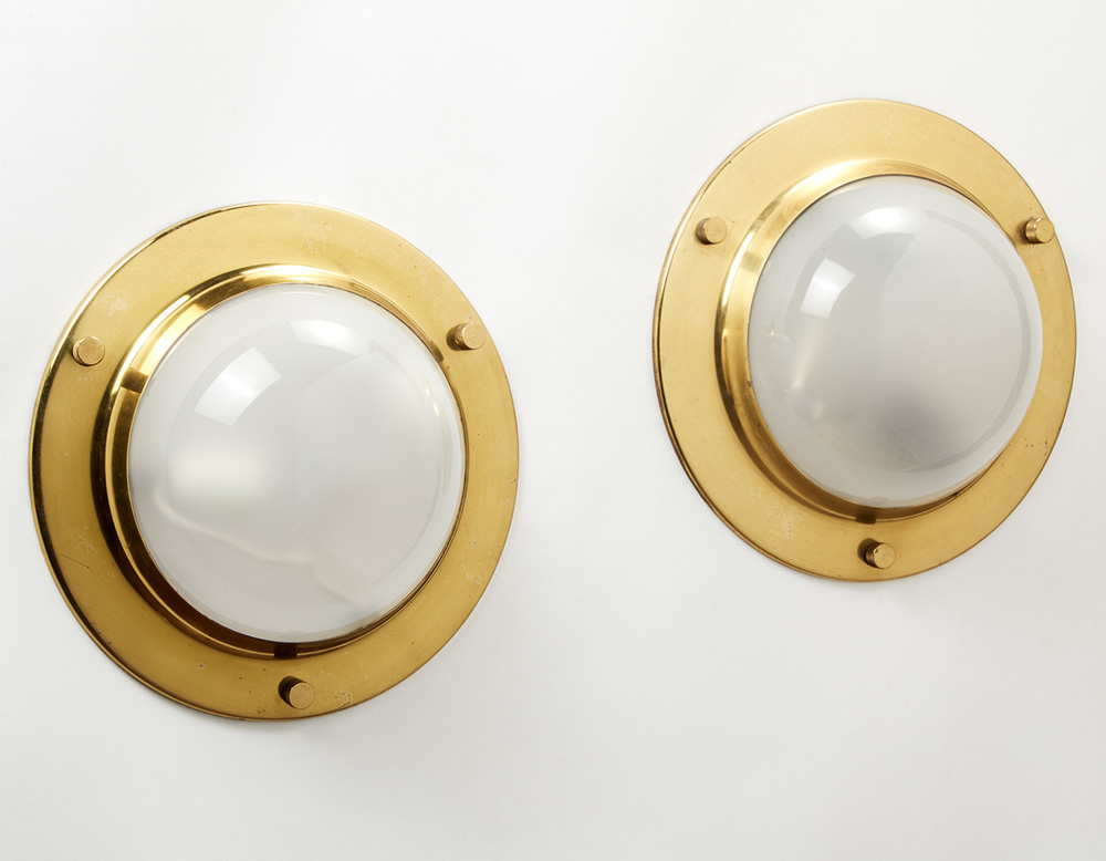 Luigi Caccia Dominioni (Milano 1913 - Milano 2016) Coppia di plafoniere modello "LSP6 Tommy". Produzione Azucena, Milano, disegno del 1965, esecuzione anni 70. Struttura in ottone lucidato, paralume in vetro smerigliato internamente (d cm 35) Bibliografia: Azucena. Mobili e oggetti, catalogo corrente del produttore, p. 212