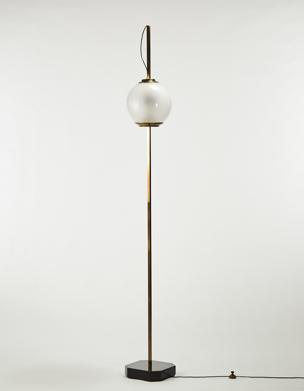 Luigi Caccia Dominioni (Milano 1913 - Milano 2016) Lampada da terra modello "LTE10 pallone". Produzione Azucena, disegno del 1958, esecuzione fine anni 60. Base in marmo scuro venato verde, asta e piattelli in ottone, diffusori in vetro soffiato smerigliato internamente (h cm 220) (lievi difetti) Bibliografia: Azucena. Mobili e oggetti, a cura di M. Imparato, F. Radaelli, S. Milesi, Azucena, Milano 2012 pp. 264-265