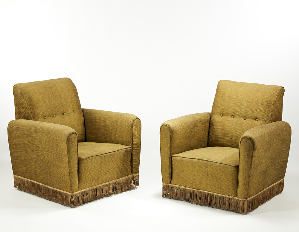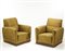 Coppia di poltrone imbottite e rivestite in tessuto giallo-verde. Struttura in legno. Esecuzione italiana, anni 50 (cm 77x83x72) (difetti) Provenienza: arredo per casa R. Milano