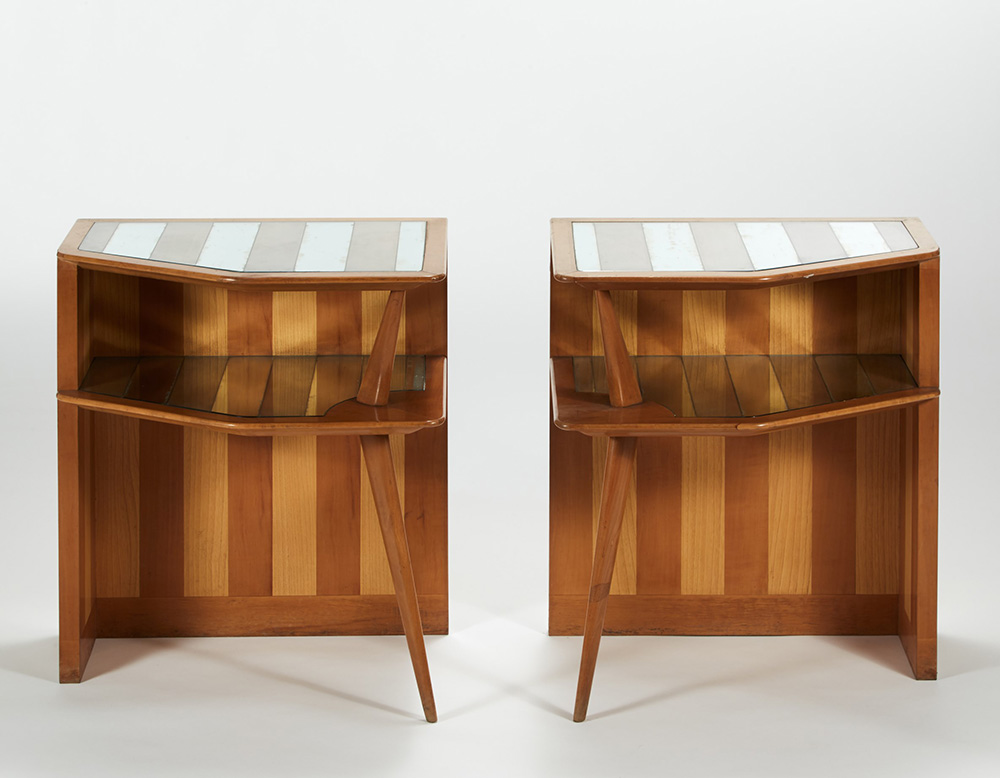 Coppia di comodini angolari impiallacciati e bordati in faggio e betulla, con due ripiani a giorno retti da un gamba e da un puntone rastremati, con piani intarsiati a fasce di legno e vetro specchiato. Esecuzione italiana, Milano, anni 50 (cm 52x59,5x37,5) (lievi difetti) Provenienza: arredo per casa R. Milano