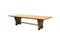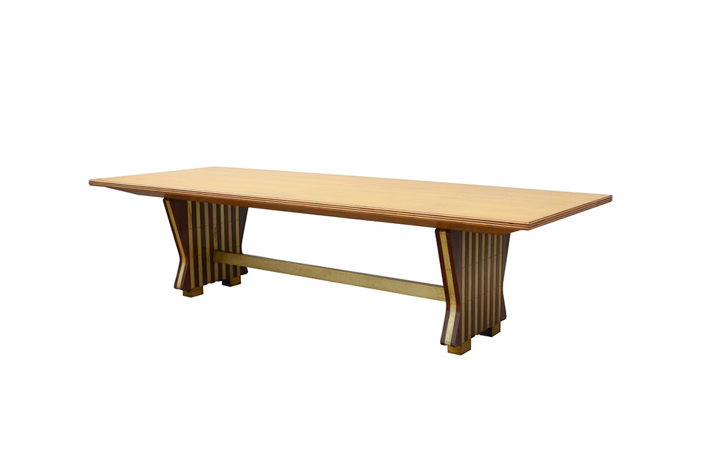 Grande tavolo da riunione, con piano rettangolare impiallacciato e bordato in legno di rovere a triplo tondino, gambe trasoversali impiallacciate in mogano e rivestite da losanghe verticali in alluminio ottonato. Esecuzione italiana, Milano, anni 50 (cm 309x79x115,5) (lievi difetti) Provenienza: arredo per casa R. Milano