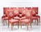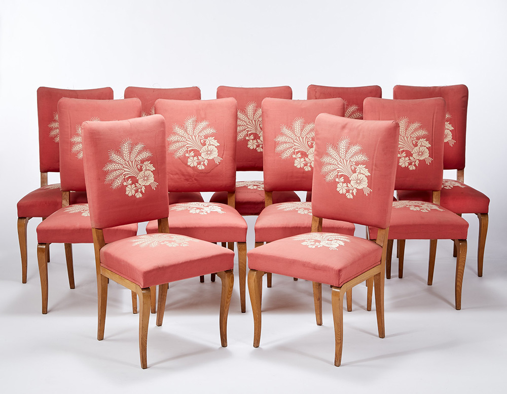 Colli (attribuito) Gruppo di undici sedie in legno di castagno con gambe mosse, seduta e schienale rivestiti in tessuto rosa trapunto a fiori e spighe in bianco. Torino, anni 50 (cm 50x102x48) (lievi difetti) Provenienza: arredo per casa R. Milano