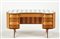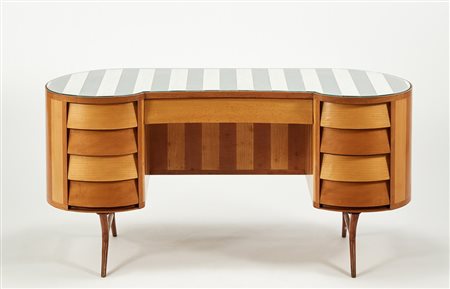 Mobile toilette di forma mossa impiallacciato e bordato in faggio e betulla, retto da gambe in legno massello rastremate e incurvate. Piano intarsiato a fasce di legno chiaro e vetro specchiato, otto cassetti nei corpi laterali e uno sottopiano. Italia, anni 50 (cm 123x60x45) (lievi difetti) Provenienza: arredo per casa R. Milano