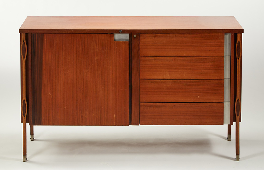 Ico Parisi (Palermo 1916 - Como 1996) Mobile per sala da pranzo a un anta e quattro cassetti della serie "Taormina". Produzione Mim, Roma 1958. Legno di palissandro indiano multistrato, massello e impiallaciato. Inserti in alluminio spazzolato (cm 144x87x45) (difetti) Bibliografia per mobili della stessa serie: "Domus", febbraio 1959; R. Aloi, L'arredamento moderno - VII serie, Hoepli, Milano 1964, p. 168; I. De Guttry, M. P. Maino, Il mobile italiano degli anni '40 e '50, Laterza, Bari 1992, p. 226; R. Lietti, Ico Parisi. Design. Catalogo ragionato 1936-1960, Silvana Editoriale, Cinisello Balsamo, 2017, p. 570