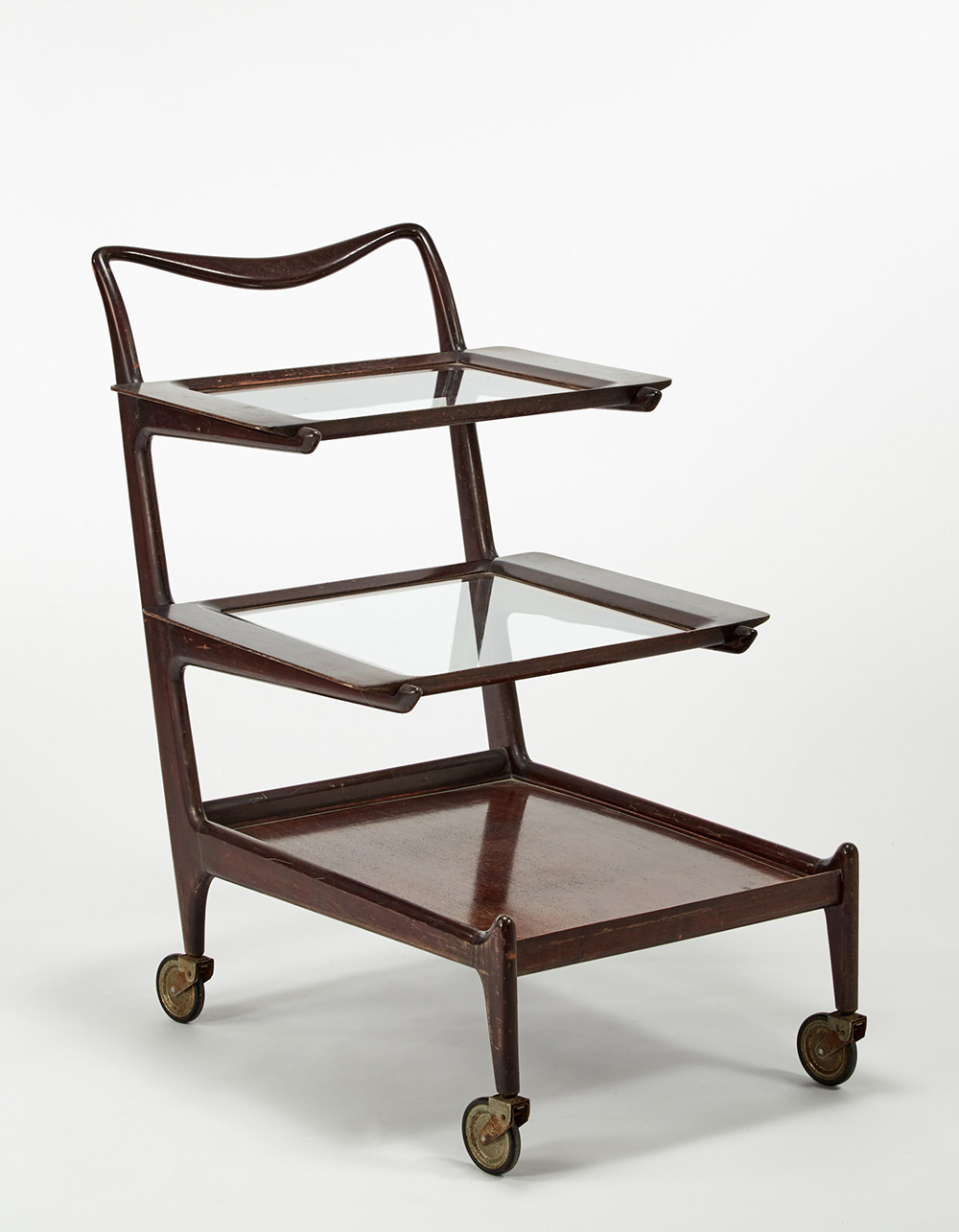 Ico Parisi (Palermo 1916 - Como 1996) Carrello porta vivande modello "57". Esecuzione Angelo De Baggis, Cantù 1952. Struttura in massello di mogano, due vassoi asportabili in mogano e vetro, ruote e minuteria in ottone. Il modello è pubblicato con il numero 1952 .DB1 dall'Archivio del Design di Ico Parisi, Como. (cm 56x87x70) (difetti) Bibliografia: R. Lietti, Ico Parisi. Design. Catalogo ragionato 1936-1960, Silvana Editoriale, Cinisello Balsamo, 2017, p. 492-493
