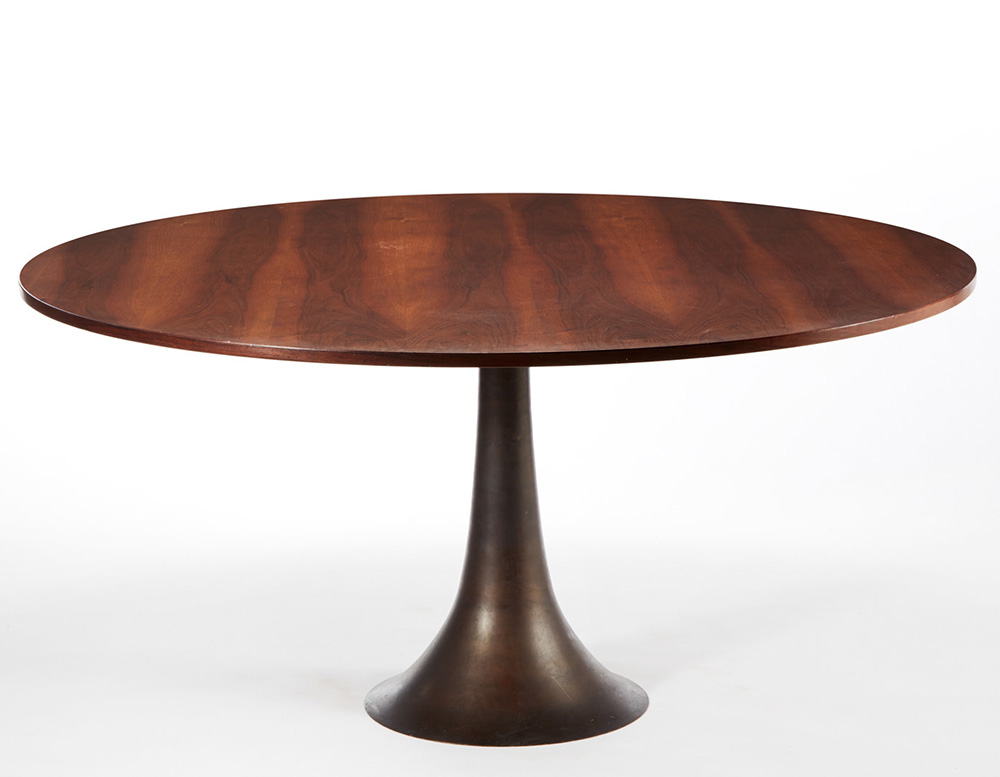 Angelo Mangiarotti (Milano 1921 - Milano 2012) Tavolo modello "302". Produzione Bernini, Milano 1961. Basamento in fusione di Bronzo tornita, piano impiallacciato e lastronato in legno (d cm 150, h cm 73) (lievi difetti) Bibliografia: "Domus", n. 400, marzo 1963, pubblicità; I. De Guttry, M. P. Maino, Il moble italiano degli anni Quaranta e Cinquanta, Laterza, Roma-Bari 1992, pp. 200-201 Table model "302". Production Bernini, Milano 1961. Bronze cast base, veneered top (d cm 150, h cm 73) (minor defects) Bibliography: "Domus", n. 400, marzo 1963, pubblicità; I. De Guttry, M. P. Maino, Il moble italiano degli anni Quaranta e Cinquanta, Laterza, Roma-Bari 1992, pp. 200-201