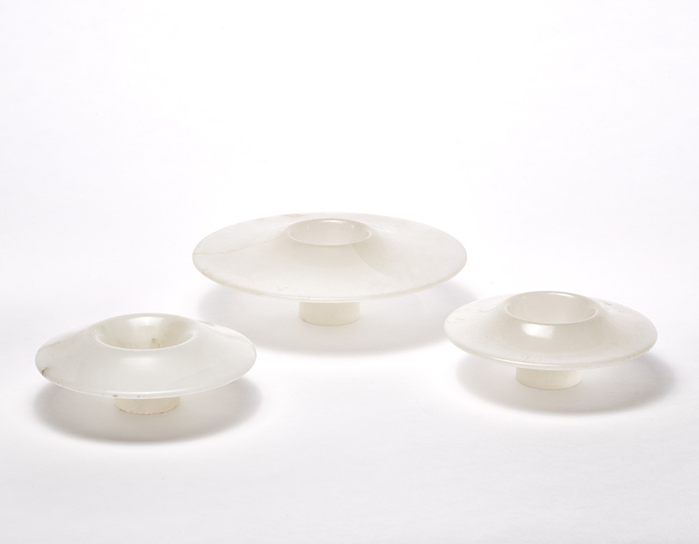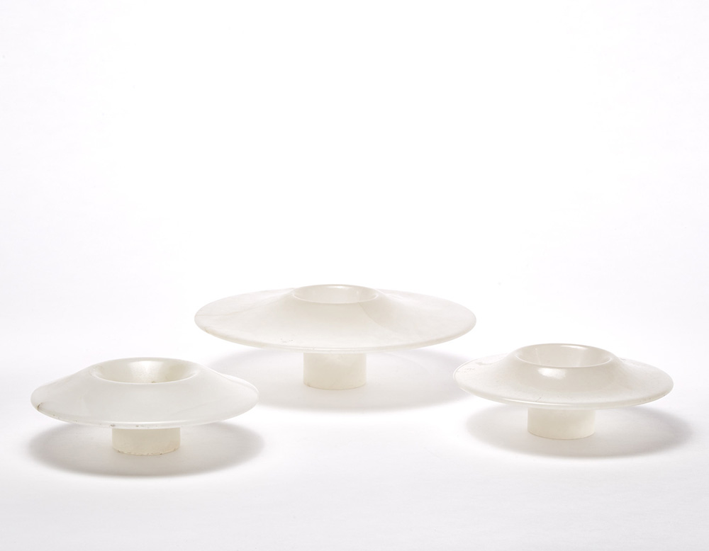Angelo Mangiarotti (Milano 1921 - Milano 2012) Tre rari vasi in alabastro scaglione finemente sagomati, esecuzione Società Cooperativa Artieri dell'Alabastro, Volterra 1982 (d max cm 28, h max cm 10) Bibliografia: F. Burkhardt, Angelo Mangiarotti, Motta Architettura, p. 314 Three rare alabaster vases, produced by Società Cooperativa Artieri dell'Alabastro, Volterra 1982 (d max cm 28, h max cm 10) Bibliography: F. Burkhardt, Angelo Mangiarotti, Motta Architettura, p. 314