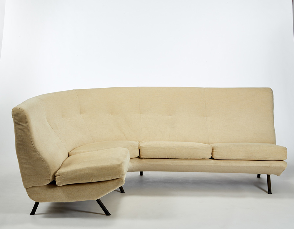 Marco Zanuso (Milano 1916 - Milano 2001) Divano ad angolo a quattro posti modello "IX Triennale". Produzione Arflex, Milano 1951. Struttura in metallo, cuscini mobili e rivestimento in cotone color crème (cm 210x80x150) (lievi difetti) Bibliografia: G. Gramigna, Repertorio del design italiano 1950/2000 per l'arredamento domestico, Vol. I, Allemandi Torino 2003, p. 25 A four-seat angular sofa , model "IX Triennale". Arfkex production, Milan 1951. Metal structure, beige upholstery ((cm 210x80x150) (minor defects) Bibliography: G. Gramigna, Repertorio del design italiano 1950/2000 per l'arredamento domestico, Vol. I, Allemandi Torino 2003, p. 25