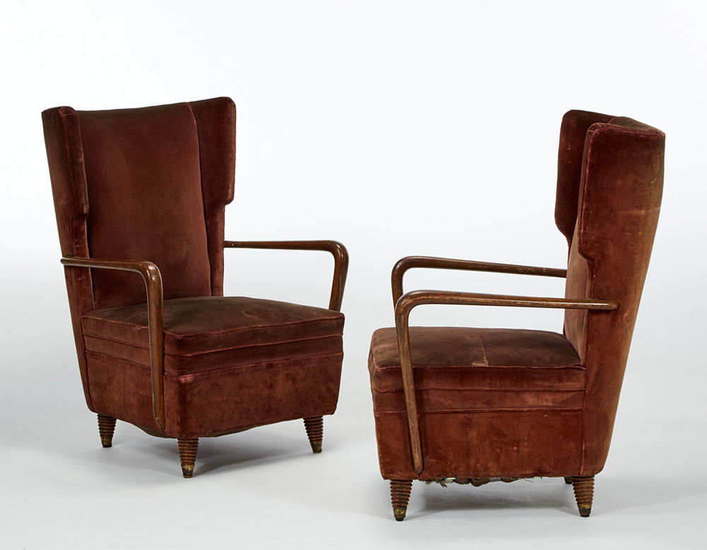 Osvaldo Borsani (Varedo 1911 - Milano 1985) Coppia di poltrone imbottite, struttura e braccioli in legno massello gambe troncoconiche a scanalature orizzontali, rivestimento in velluto bordeaux. Esecuzione Atelier Borsani (attribuito), Varedo, anni 30 (69x96x60) (difetti)