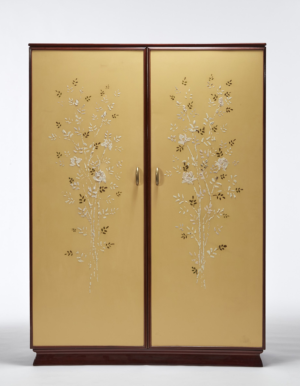 Osvaldo Borsani (Varedo 1911 - Milano 1985) Guardaroba da ingresso in legno di palissandro indiano a due ante laccate crème con decori floreali dipinti, attribuibili a Adriano Spilinbergo. Interni in ottone, cristallo e tessuto trapuntato. Etichetta metallica "Arredamenti Borsani Varedo". Anni 50 (cm 130x179x37) (lievi difetti) Wardrobe with paintings attributable to Adriano Spilimbergo. Indian beechwood, brass, crystal and fabric. Metal label "Arredamenti Borsani Varedo (Milano)". 1950s (cm 130x179x37) (minor defects)