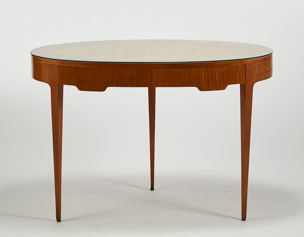 Paolo Buffa (Milano 1903 - Milano 1970) Mobile toilette impiallacciato in legno citronnier, con piano ovale e tre sottili gambe rastremate a sezione quadrata. Due cassetti sottopiano, copripiano in cristallo, puntali in ottone. Cantù, metà anni 40 (cm 110x73x55,5) (lievi difetti) Provenienza: collezione privata, Milano Accompagnate da certificazione di autenticità dell'Archivio Paolo Buffa