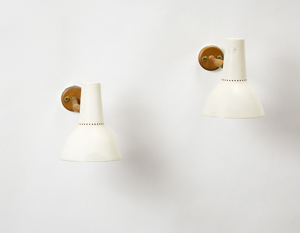 Giuseppe Ostuni Coppia di lampade da parete in ottone. O-luce, Milano, anni 50. Struttura in ottone con braccio snodato, paralume in alluminio forato laccato bianco opaco (l cm 22) (lievi difetti)
