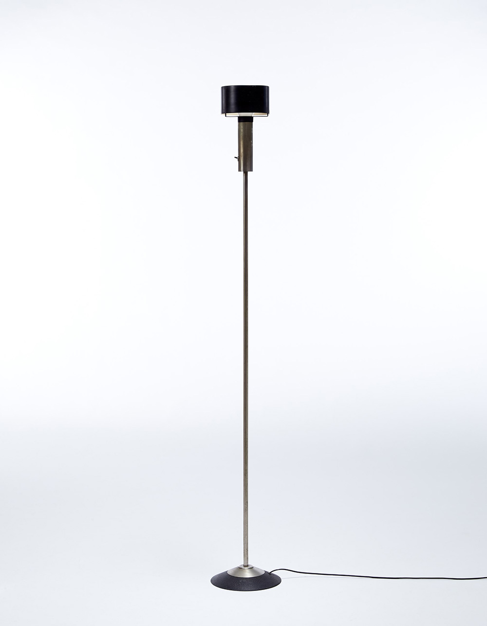 Stilnovo Lampada da terra a una luce in ottone e metallo laccato nero. Milano, anni 60. Montatura simile al modello "4088" (h cm 166) (lievi difetti) Bibliografia per modello simile: Stilnovo, catalogo n. 11